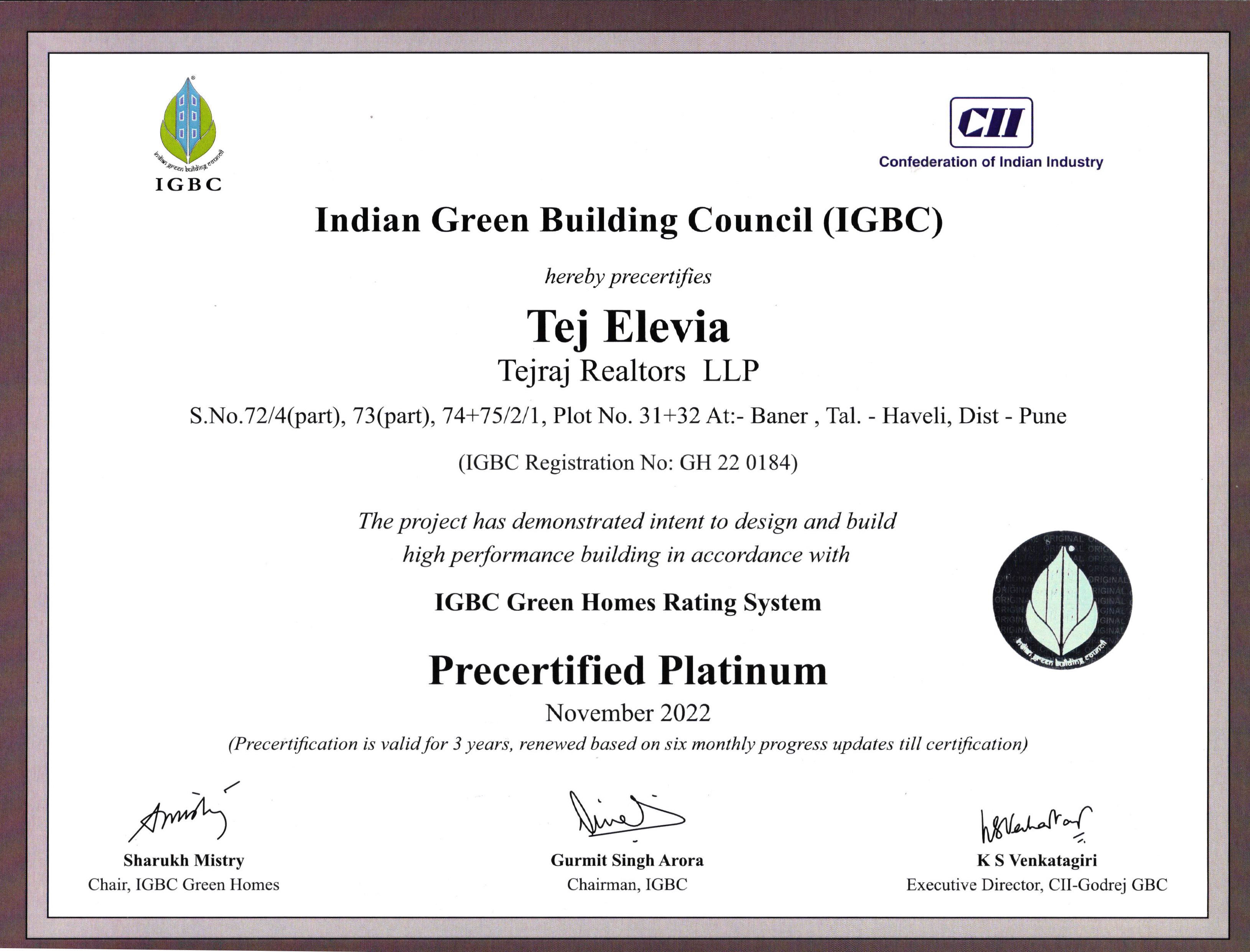 Tej Elevia is a Platinum Pre-certified Project by the Indian Green Building Council